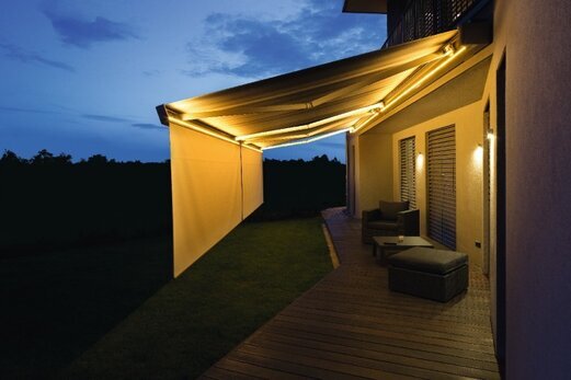 Die integrierte LED-Beleuchtung in den Markisen-Kassetten und Ausfallprofilen kann mittels Funkhandsender bedient werden.